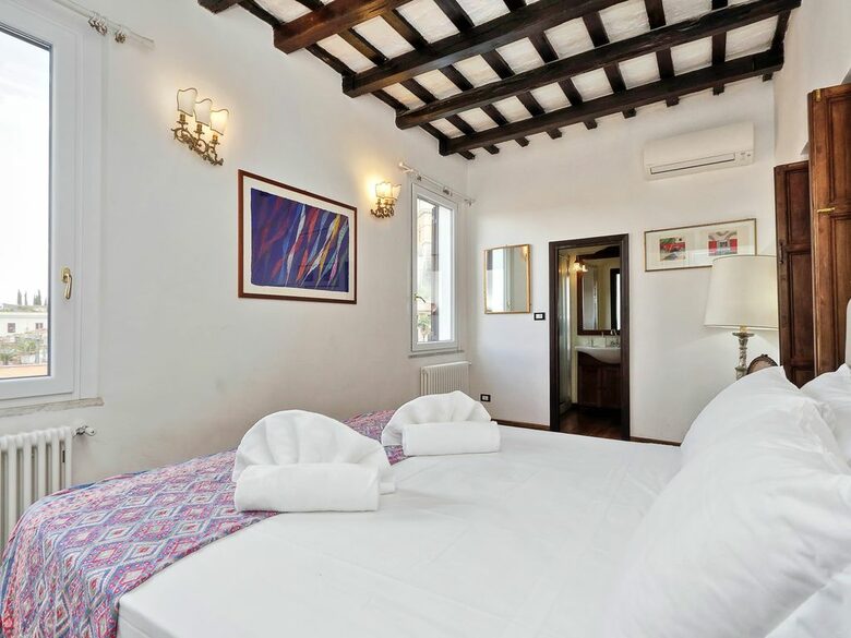 The Hassler this is not; but if you fondly remember as I do my student years in a walk up [4 flights!] garret in Greenwich Village, but with updated plumbing, new hardwood floors, ef3ecftive central heat and AC, and a roof deck overlooking Rome, this is for you. The location is perfect, right opposite the police station [safe] but in the middle of Trastevere, the old Roman Suberba,, with an endless flow of students, bars and restaurants. Directly beneath the apartment is a fine restaurant, Antica Pesa,, which we enjoyed enormously. The flat owner was very pleasant, with many good suggestions for her favorite restaurants, etc. She dealt promptly and effectively with the one mishap, the water was mysteriously turned off. to our flat . I would recommend this place provided you can deal with the stairs and want a romantic week in Rome.. ”
