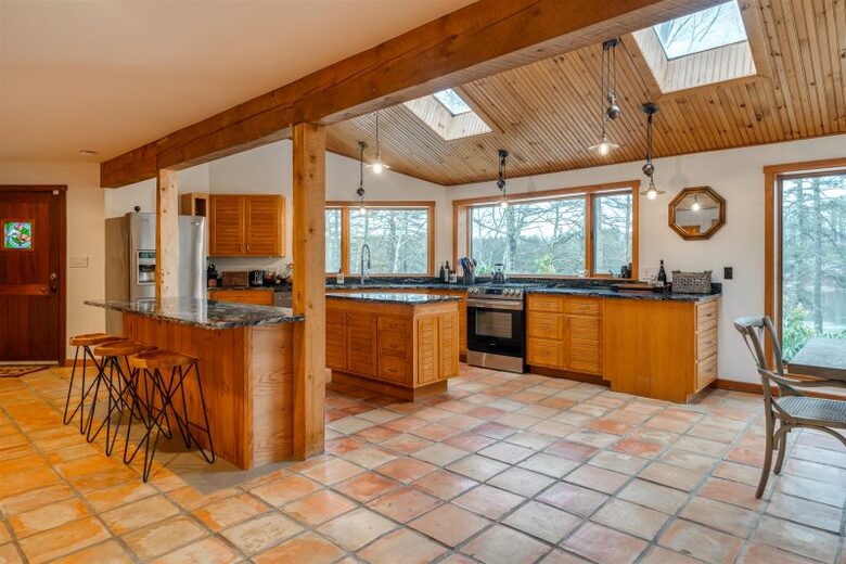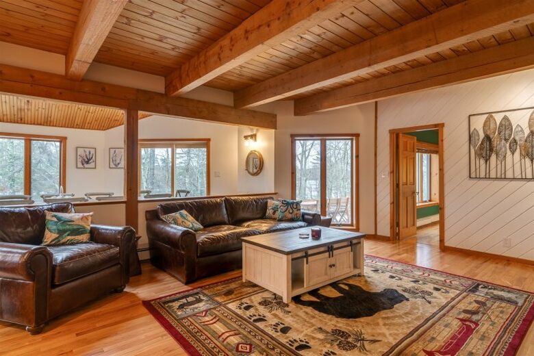 Step into a newly updated, 3200 square foot dwelling showcasing warm, natural wood elements throughout, creating a cozy, “homey” feel. The first floor offers an open concept living area with an eat-in kitchen and dining area for an idyllic entertaining hub. The kitchen is beautiful and modern with granite countertops, skylights, high-end stainless steel appliances, and a large breakfast bar. The dining table generously seats 12 next to oversized windows that bring in the water views while you eat. Nestle into a leather sofa or armchair by the roaring fire in the rustic living room featuring a fabulous built-in hutch/dry bar and a vivid flatscreen TV.