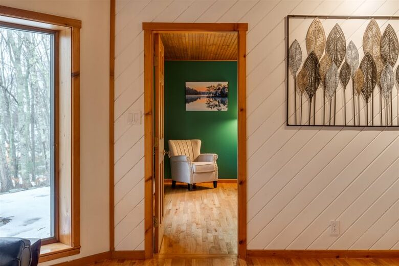 Located off of the living room is the first-floor master suite with emerald green walls that complement the wood paneling and remind us of the calming and restorative power we feel when surrounded by nature. The master comes equipped with a king bed, two walk-in closets, and a luxurious bathroom with a tiled shower and soaking tub. Back out in the main living area, you will find a mudroom area, half bath, laundry room, and a magnificent three-season sunroom offering miles of seating around the gas firepit. It’s one of the best spots in the house to catch uninterrupted views of the land and water frontage.