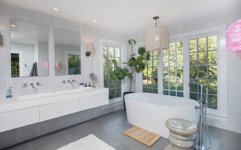Five additional bedrooms await at the end of the night with newly renovated bathrooms; the master bedroom has a King bed, a Gas fireplace, private patio access, and a reading couch. The master bath is a modern oasis with double vanity, walk-in shower, water closet, and a soaker tub in front of windows with verdant views.