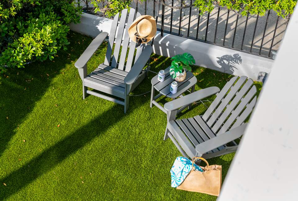 As guests walk up to their home-away-from-home, they will be greeted by a delightful porch and a professionally turfed courtyard, perfect for enjoying the warm breeze or firing up the grill. Upon stepping inside, they'll find a full kitchen, thoughtfully designed to maximize functionality and efficiency while exuding charm. In the living room, they can curl up on the leather sofa or enjoy breakfast in the cozy dining nook. Throughout the unit, bright pops of color add a playful touch, infusing the space with energy and warmth.